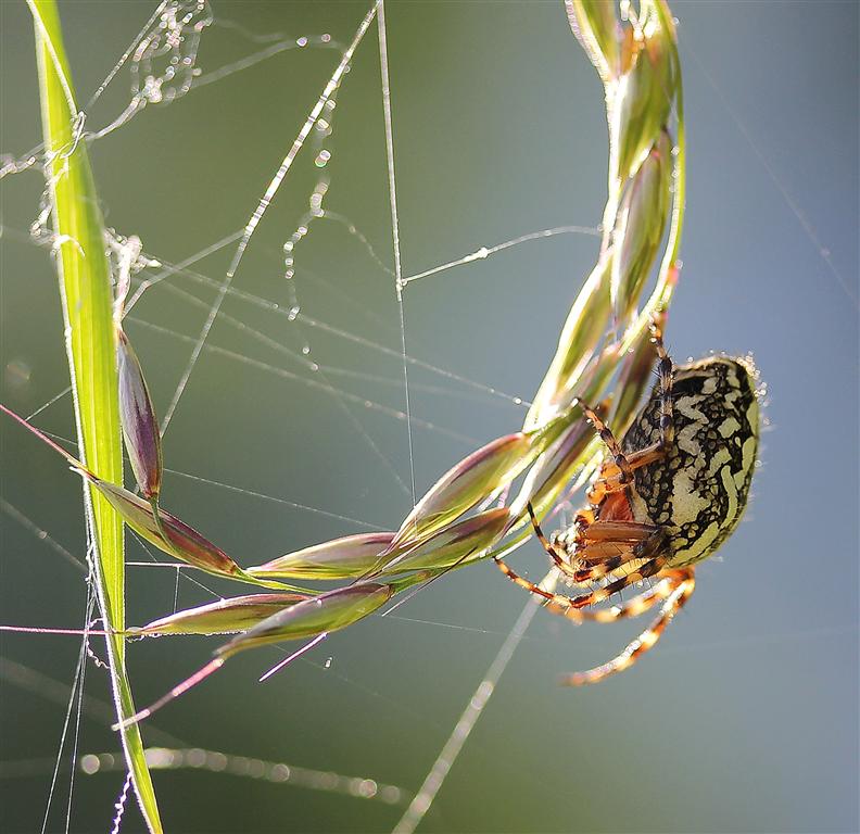 Cela faisait bien une dizaine de jours que je traquais de toutes petites araignées, allongé dans l’herbe mouillée durant des heures, à observer leurs toiles et à espérer qu’elles voudraient bien se montrer devant mon oeil macroscopique…Le plus souvent, je les distinguais à peine, prudemment tapies en retrait de leur toiles et s’arrangeant toujours pour ne pas apparaitre franchement devant mon objectif inquiétant…