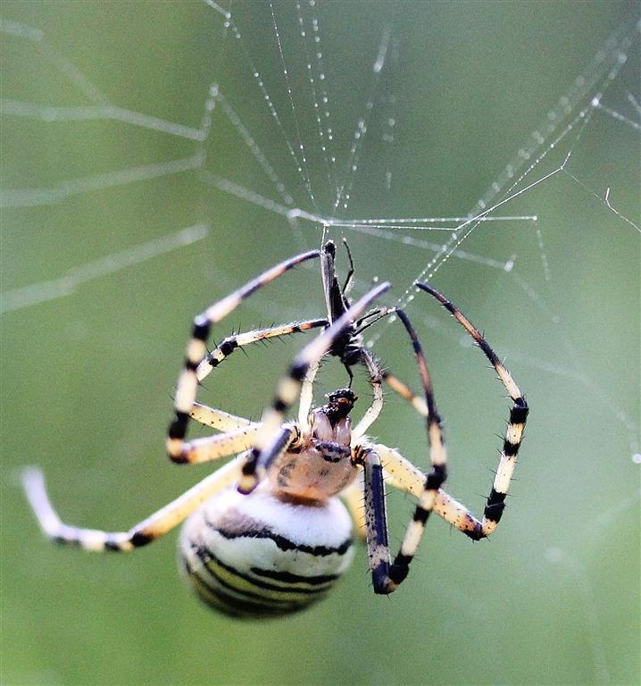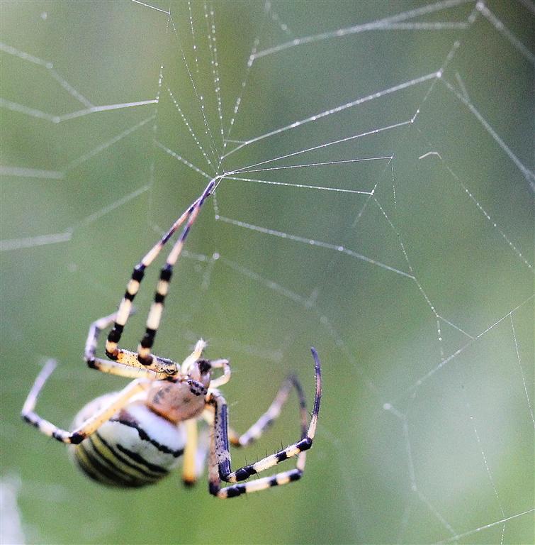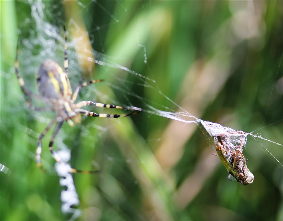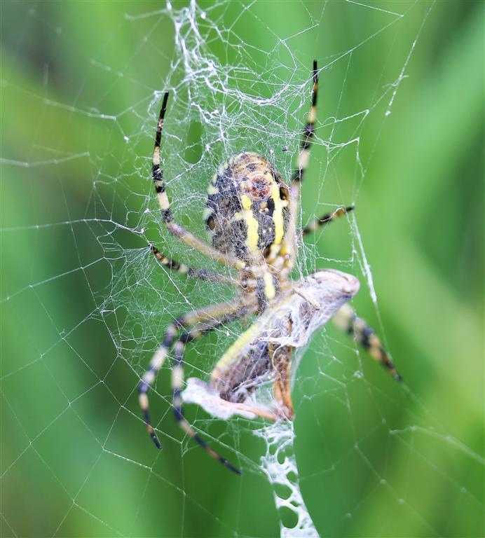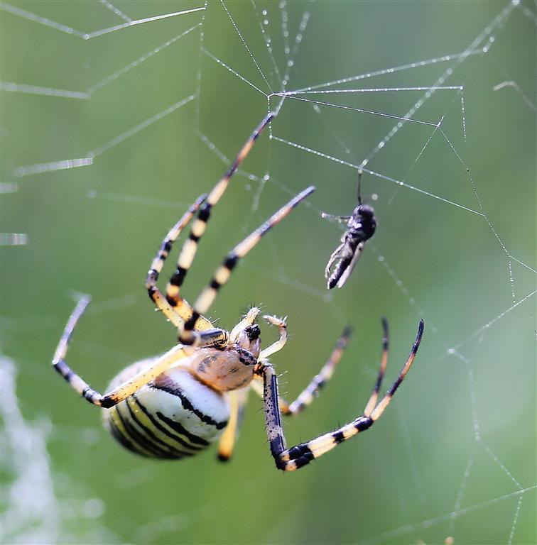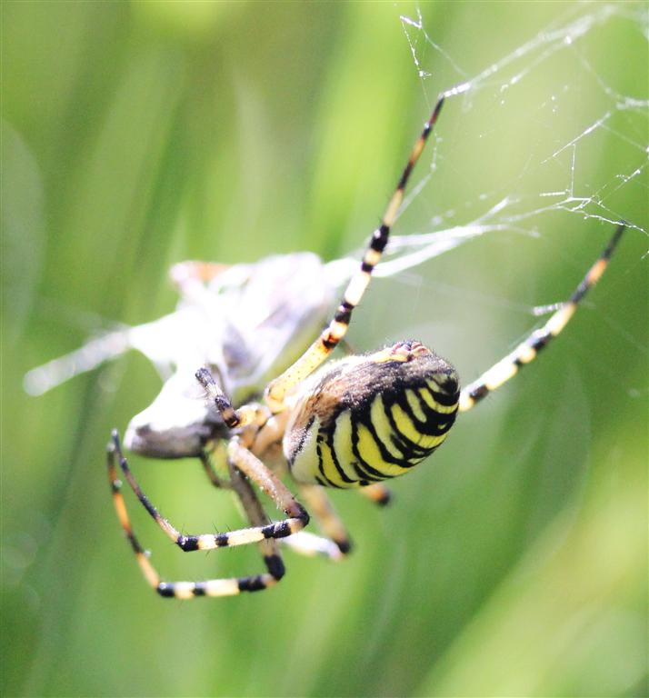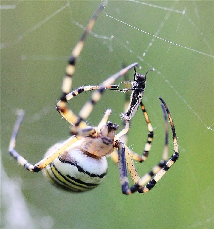 Et en plus, l’alternance des stries jaunes et noires double les captures d’insectes en agissant comme leurre visuel me rendant moins visible pour mes proies, bien qu’au milieu de ma toile…Un costume doublement utile donc !