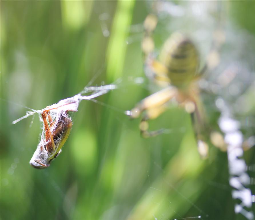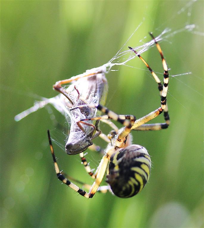 – Pensez donc ! Ces lourdauds de volatiles ne me font pas peur, ce serait même l’inverse ! En effet, avec ma belle tenue rayée de jaune et noir, ces idiots me prennent pour un frelon et se méfient de moi; c’est d’ailleurs pour ça qu’on me surnomme l’argiope frelon…