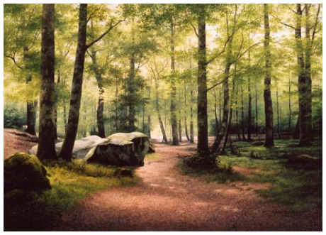 Ce tableau représente une forêt dense de chênes où quelques rayons de soleil traversent le feuillage et éclairent quelques sangliers qui gambadent dans les sous bois.