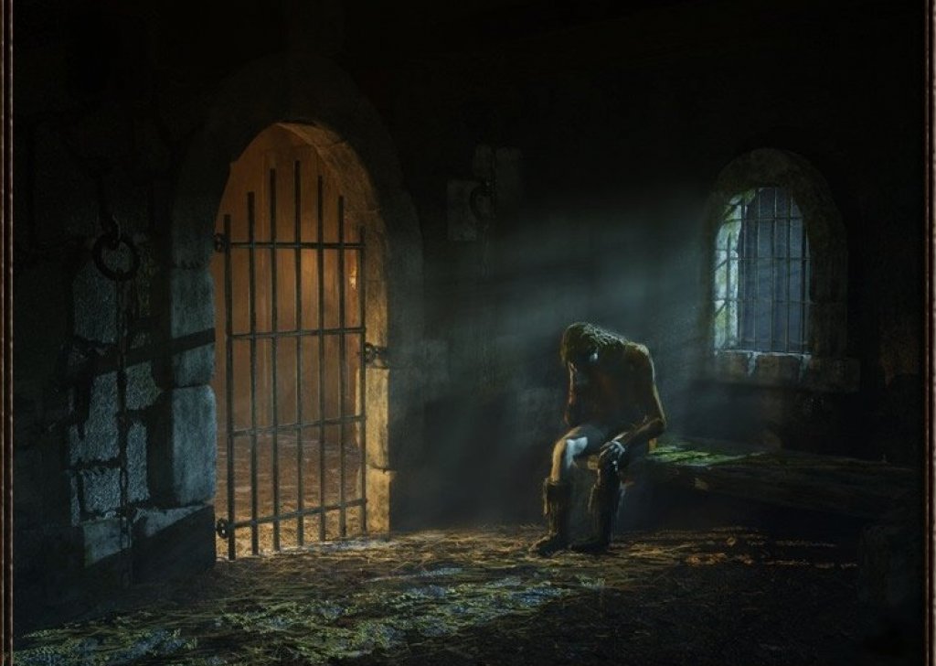 Ce tableau représente un cachot ou croupit un personnage au long nez. Si on regarde attentivement le mur du fond de la cellule, on aperçoit un autre tableau accroché, représentant une autre cellule avec un autre personnage également emprisonné. Et si l’on observe bien cette cellule, on y distingue également un tableau accroché représentant une cellule et ainsi de suite….