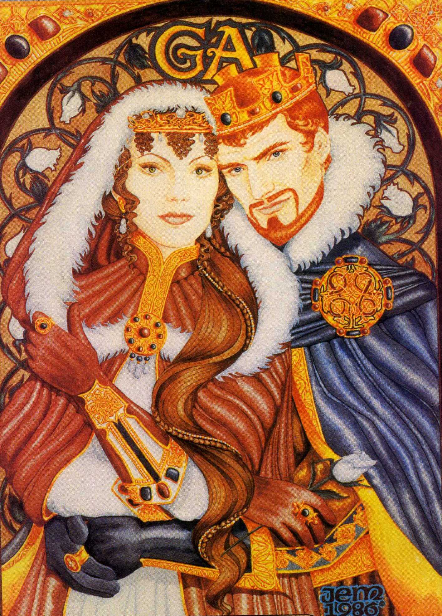 Un roi et sa reine, parés de leurs couronnes, de somptueux bijoux et vêtements, se tiennent enlacés face au spectateur.